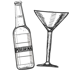 Bebidas do aperitivo que inclúen o noso Vermú de 21 Botánicos das nosas hortas ecolóxicas, a nosa Sangría e a nosa propia cervexa; Peregrina.