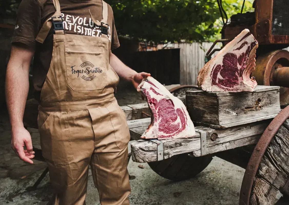 Cociñamos o noso propio produto en brasas vexetais ecolóxicas que manteñen os sabores puros da nosa horta ecolóxica, do noso gando criado en liberdade e en ecolóxico nos montes galegos e dos peixes e mariscos de pesca de proximidade das nosas rías.